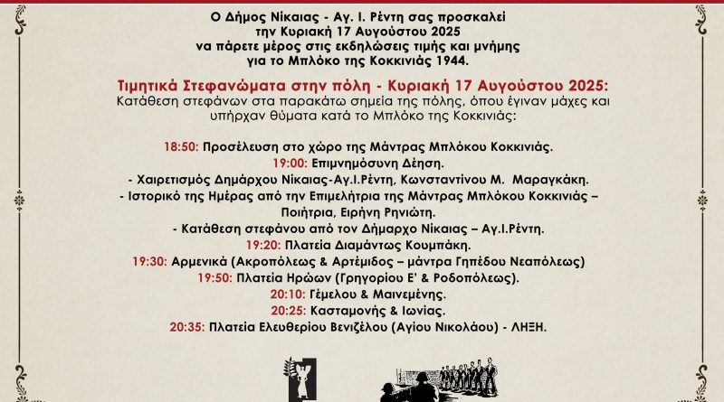 ΠερισσότεραΟ Δήμος Νίκαιας – Αγ. Ι. Ρέντη διοργανώνει την Κυριακή 17 Αυγούστου 2025 εκδηλώσεις τιμής και μνήμης για το Μπλόκο