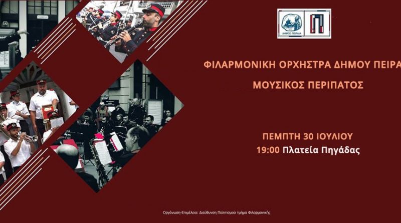 Η Φιλαρμονική Ορχήστρα του Δήμου Πειραιά, συνεχίζει τους μουσικούς περιπάτους, ψυχαγωγώντας τους Πειραιώτες και τους επισκέπτες της πόλης, με ξεχωριστές νότες και μελωδίες. Το