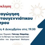 Σας προσκαλούμε την Τετάρτη 4 Δεκεμβρίου στις 19:30 στο προαύλιο του Δημοτικού Θεάτρου Πειραιά, στη φωταγώγηση...
